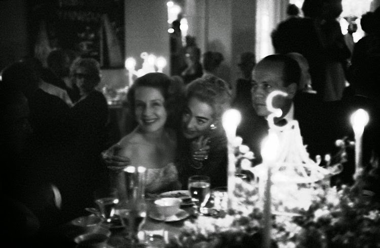 Norma Shearer and Joan Crawford, with producer Jerry Wald, at a party in Hollywood, 1959.  Photograph by Eve Arnold.