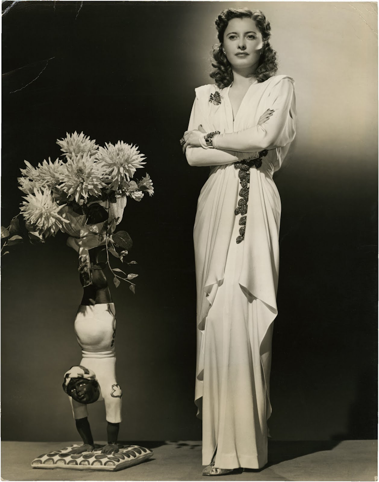 Stanwyck looking very... well, very Stanwyck. And wearing a gown by her favorite designer - and close friend - Edith Head. I haven't been able to tell if this gown was worn in a film or was just run up for publicity purposes, but it's quite similar to those worn by Stanwyck in Preston Sturges' wonderful The Lady Eve.