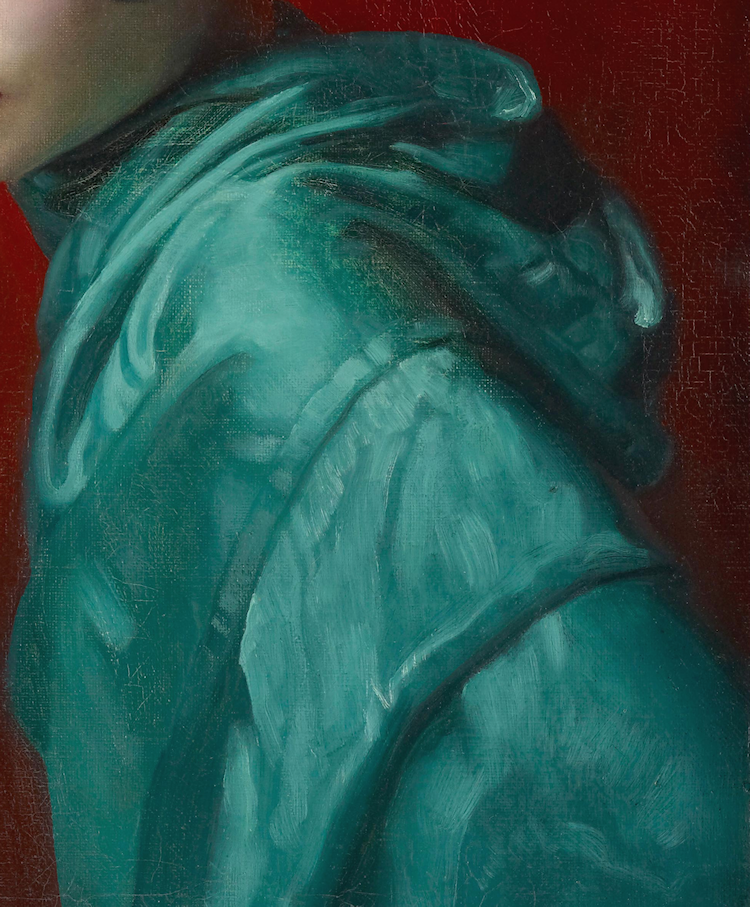 I find this painting of an unknown young woman quite astonishingly beautiful. The perfect shape of her rouged lips, the arching penciled brows, her hair sleekly bobbed in the style made iconic by Louise Brooks. And then her sheer physical beauty: the refined and elegant bone structure, the softness of her skin, the depth of her gaze. The simplicity and directness of the pose - and the tension in the line of her brow - are elements that help give the portrait such power. But more than anything else, the ravishing color.