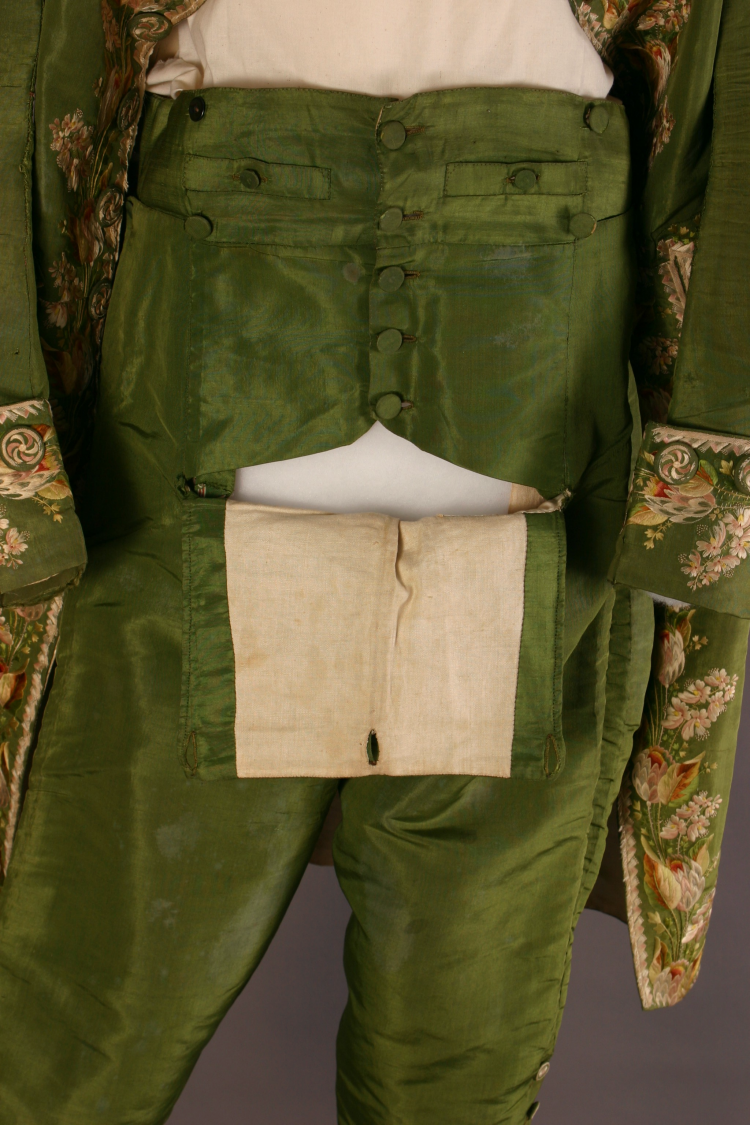 This dress suit, circa 1790, resides in the Henry Ford Historic Costume Collection of Wayne University. I adore it, not least because this shade of green is one of my absolute favorite colors. Though beautifully cut and embroidered, and quite costly to produce even in its day, it hasn't survived in the best of shape. Much of the embroidery has suffered. There are patches of color loss in the green silk. And badly done alterations and/or repairs were made during the twentieth century, most likely so it could be worn in a theatrical production. Somewhere along the line it has also lost its coordinating waistcoat. Sad, all of that. But it does survive.