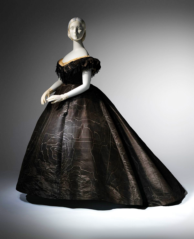 I should note than most of these gowns were photographed without the full degree of structural support they were designed to employ. While it can certainly be argued that the folds of beautiful yardage draping and trailing on the ground are very graceful, many of these examples were originally worn with a crinoline so large that it filled out the skirt of the gown, eliminating much - sometimes nearly all - of the lovely excess of fabric we see here.