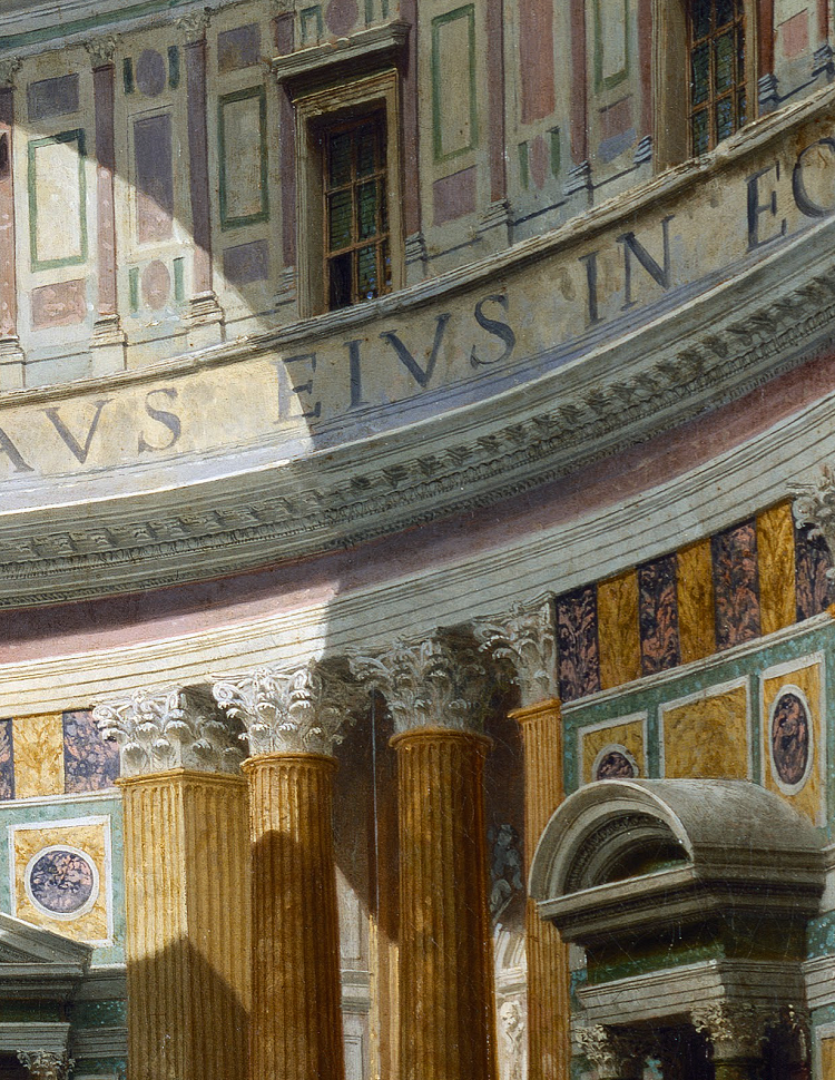 In Panini's day, as in our own, the Pantheon was one of the great tourist attractions of Rome. Built under Hadrian in the 2nd century, this monumental domed temple has survived intact, owing to its consecration as a Christian church—Santa Maria Rotunda—in AD 609. Panini's depiction is populated with foreign visitors and a lively mix of Romans from all social strata who congregate in the Pantheon to pray, to chat, and to admire the wondrous architecture.