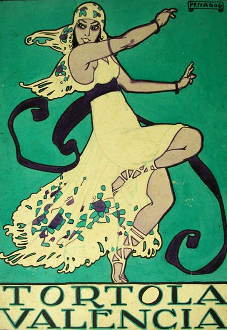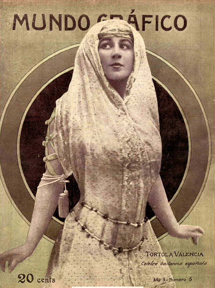 Carmen Tórtola Valencia (18 June 1882, Seville - 13 February 1955, Barcelona), early modern dancer, choreographer, costume designer, and painter. Born in Seville to a Catalan father and Andalusian mother, she was three years old when her family emigrated to London. For unknown reasons, she was left in the care of a wealthy British couple when her parents left England and settled in Mexico; both her mother and father died by the time she was twelve. Always reticent to discuss her personal life, little is known of her early years, and she encouraged an air of mystery about her person.