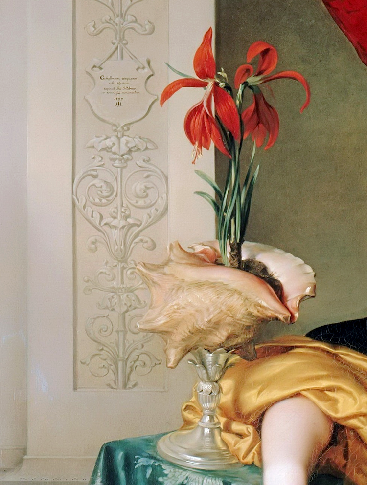 I love this portrait, painted right before or right after the artist and his dear model wed. She's a lovely woman, the faithfully rapt dog is charming, the textures are wonderfully described and luxurious, and the details are both beautiful and a bit odd - the silver and conch shell flower pot, especially. Her artfully unnatural pose, the strong, unchecked diagonal formed by the background drapery and the golden lining of her sleeves, and the disorienting ripple and turning of the carpet add a tension to the composition, unexpected in what otherwise might be a straightforward record of the artist's beautiful beloved. But it's the color that really attracts me to this work: that glorious swathe of red damask; the green-blue, the tone shifting slightly as it moves into shadow; the subtle contrast of gold; and the carpet's reference of all three dominant colors. So wonderfully calculated and harmonious.