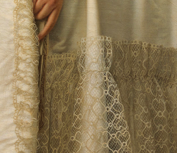 The Queen's likeness is generalized and quite doll-like - she looks nothing like the sharp-minded woman she must have been - but I love this painting's beautifully calculated low vantage point perspective and, especially, the amazingly detailed rendering of fabric and lace; for someone like me, these passages are really awe inspiring.